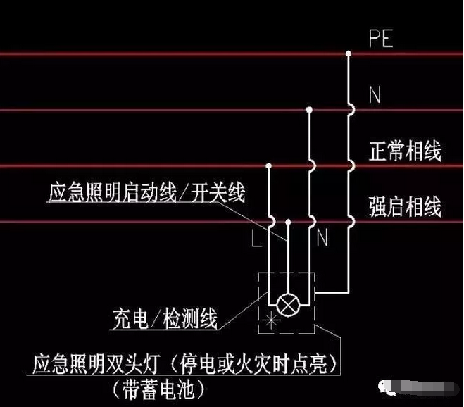 这是应急灯具在充电/检测线失电后自带电池供电的强启方式。为保证给应急灯具的自带电池充电,这根线一般情况下都是接通的,即有电状态。