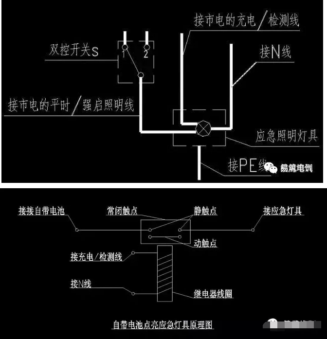 充电/检测线一端接市电,另一端接应急灯具的自带电池。顾名思义,这根线有双重作用。在市电保持有电的状态下,此线用作给应急灯具的自带电池充电,在市电失电的情况下,通过检测线,将市电的零压信号传送给自带电池,由自带电池供电给应急灯具,从而应急灯具点亮,达到启动应急灯具的作用。