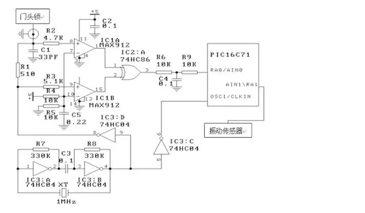 电路原理:采用MAX912构成具有温度补偿的电子防盗系统电路,其中用门头锁(或200cm2敷铜板)作为电容器的一个极板构成感应面。当人体靠近时成为另一个极板,产生一个随着人体接近而增加的电容值(介于 2pF至5pF之间)。如人体在距门头锁20cm时可产生大约2pF的电容值。由74HC04与晶体构成1MHz方波信号一路送至单片机PIC16C71 作为振荡信号,另一路送至接近感应探测电路,分两路送入异或门(XOR),两路信号通过几乎相同的比较器传输到XOR输入端,其中一路通过比较器直接进入异或门的一个输入端,另一路被延时0.693R1C1秒并由比较器整形后送入另一输入端,R6和C4对XOR输出滤波后产生与距离成正比的电压。由于 XOR输出信号的占空比正比于R1、C1延时与比较器传输延时的总和,所以比较器延时的微小变化会掩盖感应电容的微小变化。图中的延时电容包括一个 33pF电容和15pF屏蔽线电容以及门头锁(或200cm2敷铜板)的感应电容。在输入方波的正半周,通过R1将等较的延时电容充电至于5V。当无人接近探测器时,该电容等于48pF,在上面一路XOR输入产生16.5ns的延时。当人体距探测器20cm处时,电容增加到期50pF,产生17.3ns延时,产生一个仅0.8ns的时间差。要检测出如此小的时间差,且在整个温度范围内要保证精度,比较器必须具有非常稳定的失调电压和传输延时(延迟时间同时受失调电压和传输延时的影响)。因此,采用高速、高精度电压比较器MAX912,并利用双比较器法使比较器失调电压、漂移、传输延迟等效应的影响相互抵消。