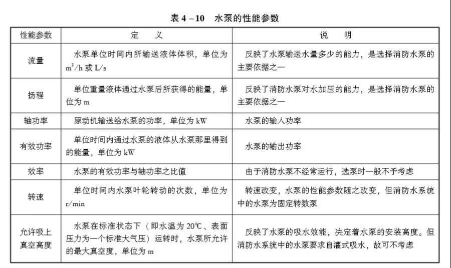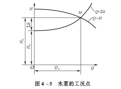 (3)工况点。水泵的性能参数并非固定值,而是能够在一定范围内变化,见图4-5。其扬程、轴功率、效率、允许吸上真空高度与流量之间的关系能够用曲线来表示,称为水泵性能曲线。选择消防水泵时,主要依据水泵的流量—扬程曲线来选择。这条曲线反映了水泵的工作能力,水泵运行时,能够提供这条曲线上任意一点所对应的流量和扬程。但水泵要发挥其工作能力,还必须与管路系统结合起来。水泵与管路系统连接后的实际工作状态就是水泵工况点,即水泵装置在某瞬时的实际出水量和扬程等。