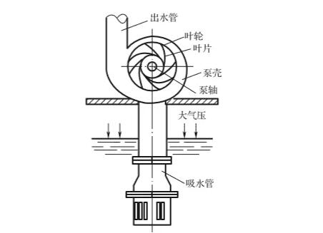 (1)工作原理。在消防给水系统中主要采用的消防泵类型为离心式水泵。这种水泵的工作是靠离心力进行的,见图4-4。水泵启动前,泵壳内需充满水。启动时,驱动器通过泵轴带动叶轮旋转,叶轮上凸起的叶片会使水随之一起旋转。水在离心力的作用下,被抛入出水管中,同时,使吸水管内形成真空。外部的水会在大气压的作用下,经吸水管进入水泵。这样,水就会源源不断地经水泵加压,输送出去。